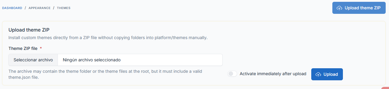 Admin -> Themesto upload a theme ZIP - Optionally enable activation during upload