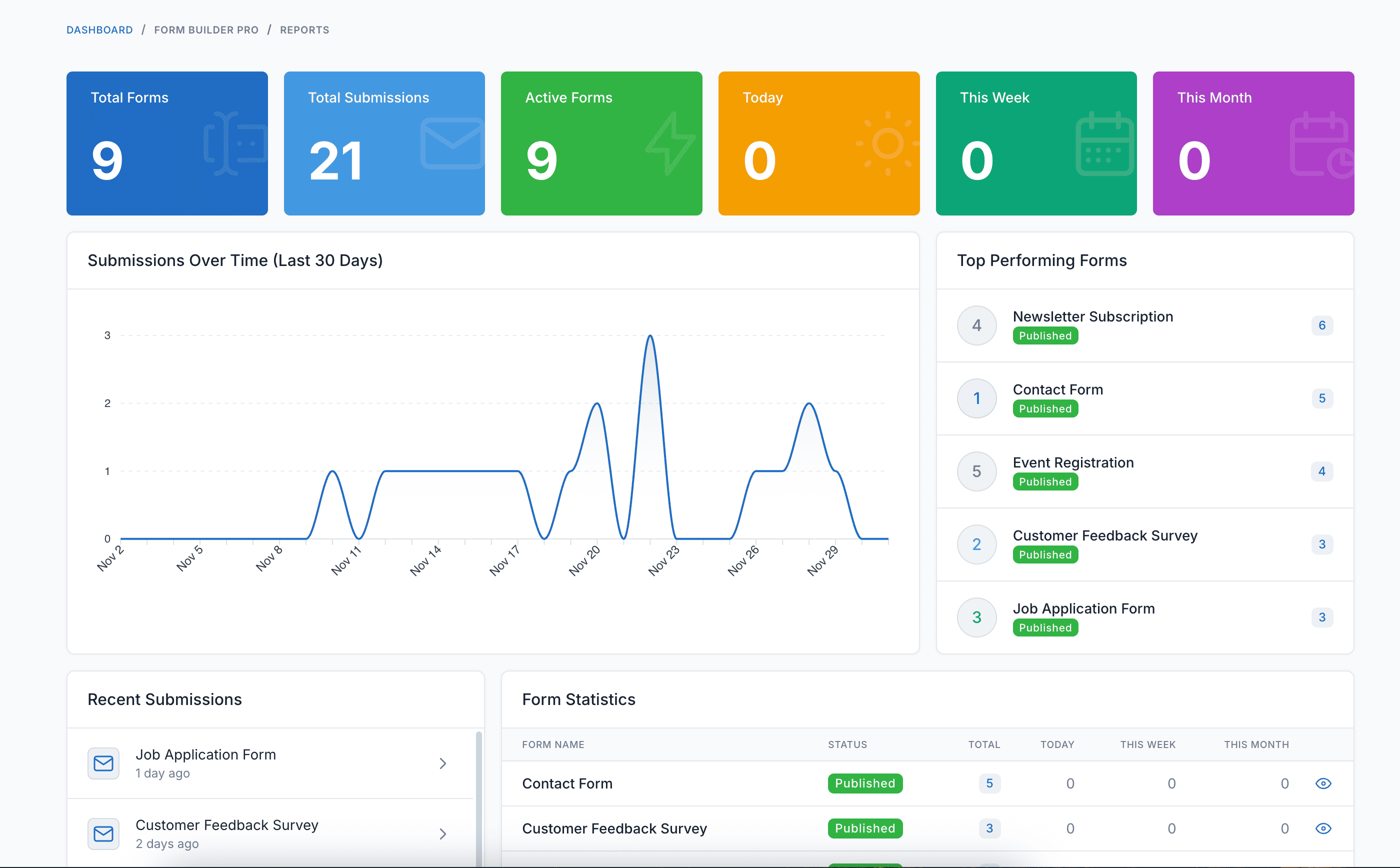 - Reports & Analytics – View submission statistics, charts, and track form performance over time.