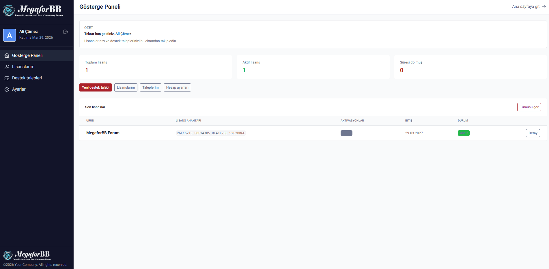 Customer dashboard: licenses, support requests, and account — a clean, simple interface (for the customer forum)