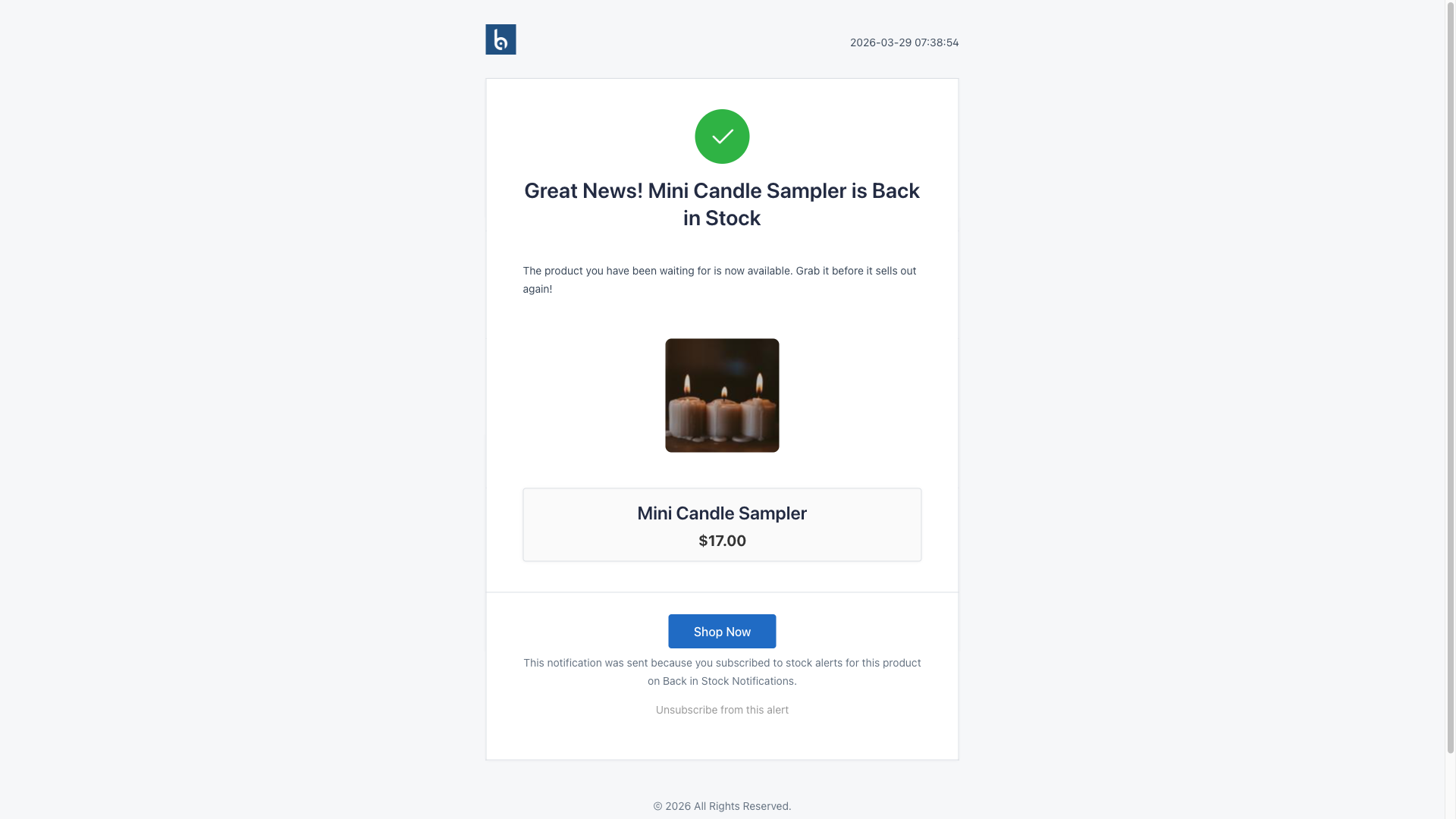 - Customizable Email Templates – Email templates with product name, image, direct purchase link, and unsubscribe URL. Fully customizable from the admin panel.