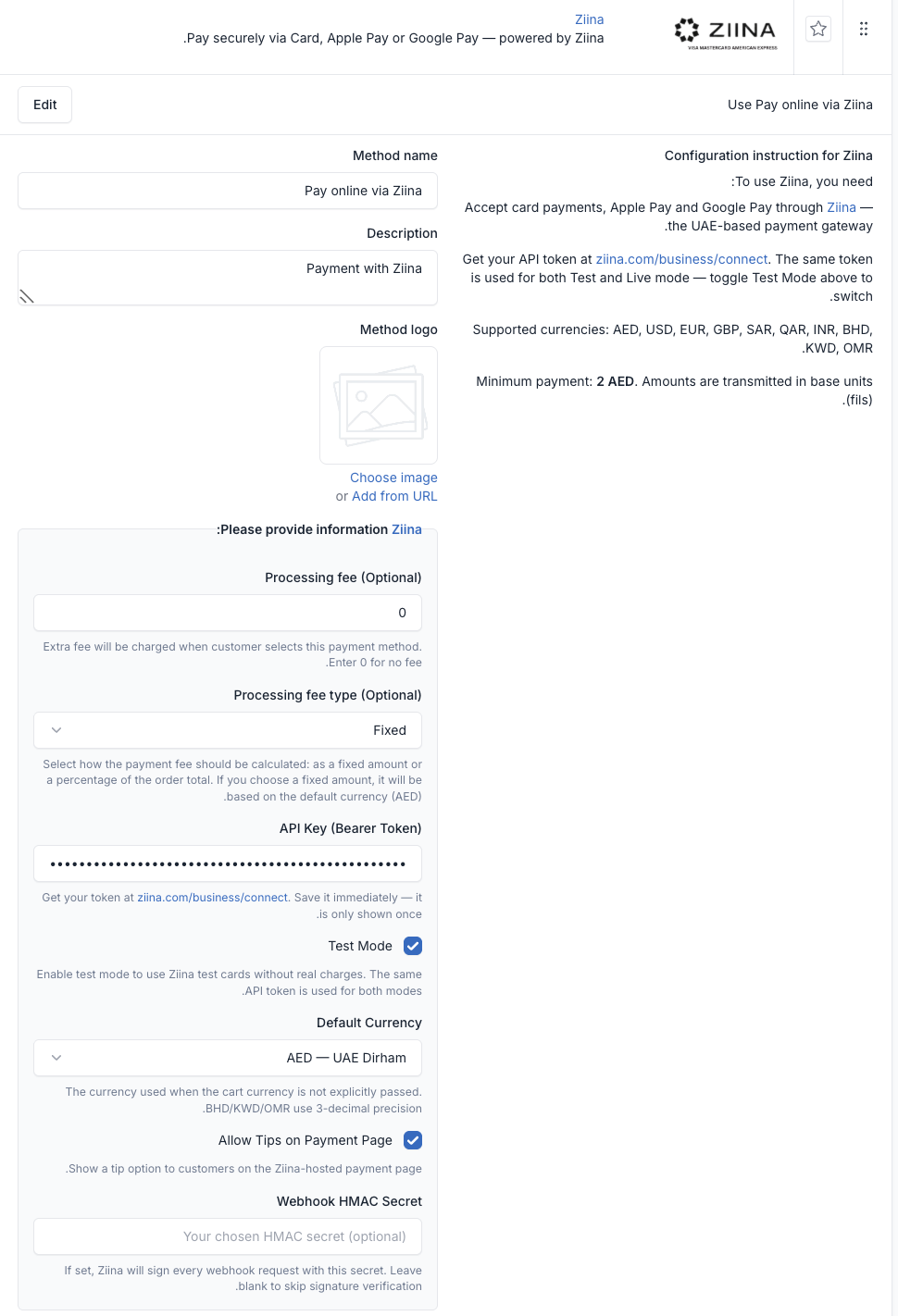 | Status | Enable/disable Ziina on the checkout |