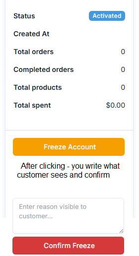 Allows admin to freeze a customer account with a custom message. Frozen customers are immediately logged out and shown the message until unfrozen.