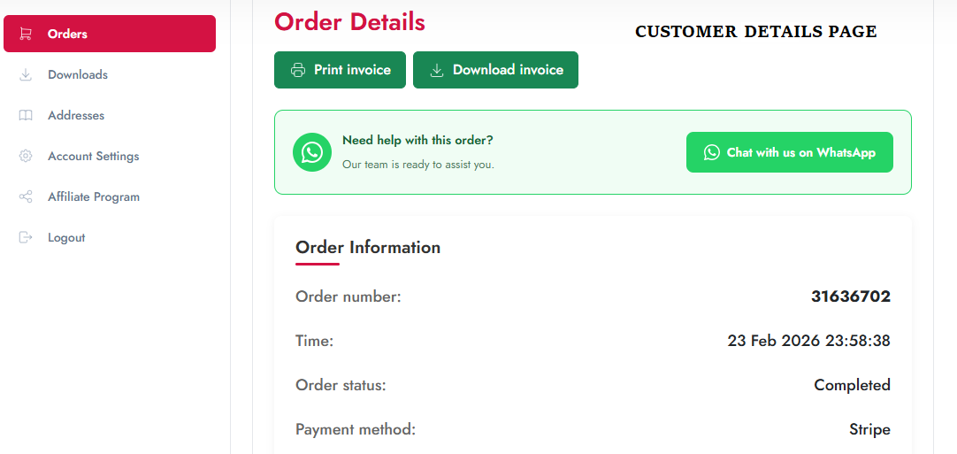 WhatsApp Order Chat is a Botble ecommerce plugin that adds a WhatsApp chat button directly to the customer order detail page. The WhatsApp chat only appears in order details page. Once the admin saves their WhatsApp number in the settings, customers can instantly reach out about any order with a single click. WhatsApp opens with the admin's number and a pre-filled message that includes the order number automatically.