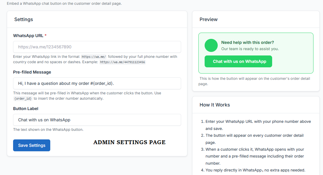 Embeds a WhatsApp chat button on the customer order detail page so customers can contact the admin directly from their order.