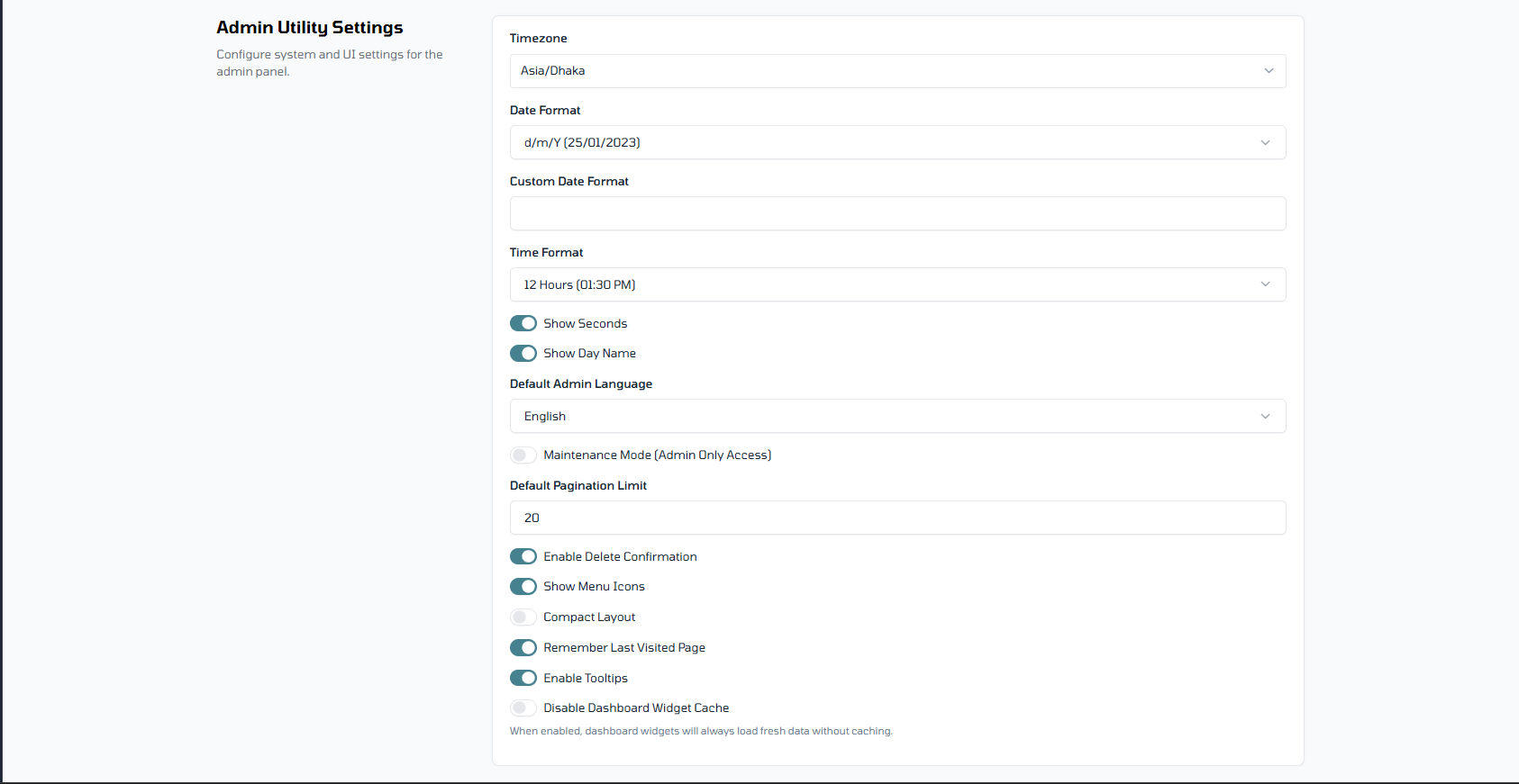 - Default Pagination Limit: Sets the number of rows shown in admin tables by default.
